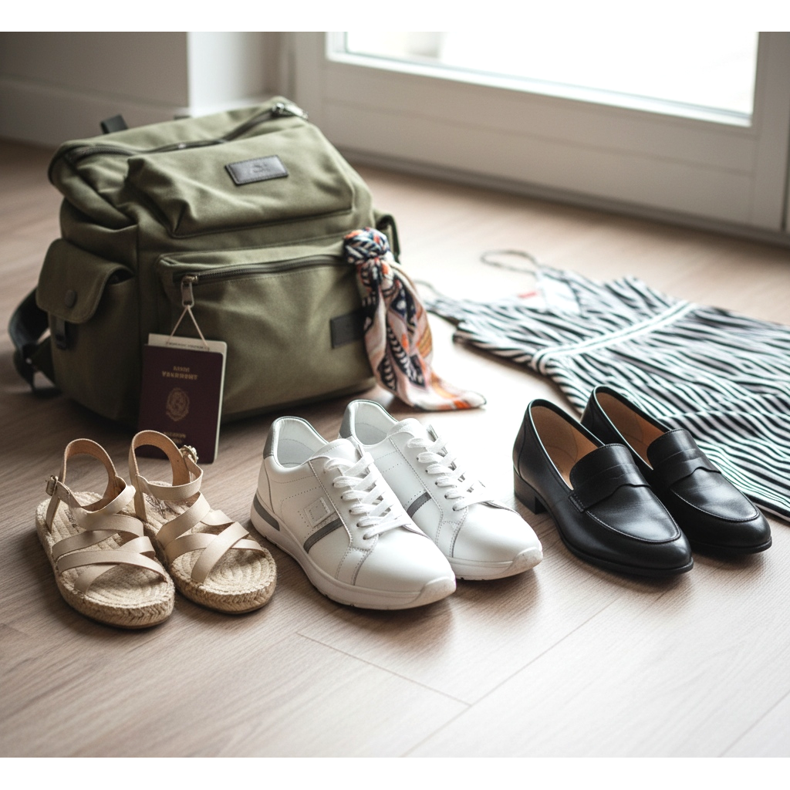 Een beproefde formule voor elke reis is de regel van drie paar: comfortabele schoenen voor sightseeing, elegante schoenen voor uitgaan en strand- of sportschoenen, afhankelijk van de aard van de reis. Deze combinatie dekt vrijwel elke situatie, van 's ochtends joggen tot een avonddiner.