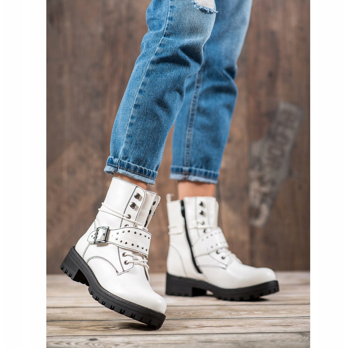 Ze zijn gemaakt van hoogwaardig ecologisch leer en zorgen voor duurzaamheid en comfort. De decoratieve gesp en strass-steentjes geven ze karakter en benadrukken hun unieke stijl. De zwarte, dikke zool contrasteert perfect met de witte kleur van het bovenwerk waardoor er een harmonieus geheel ontstaat.