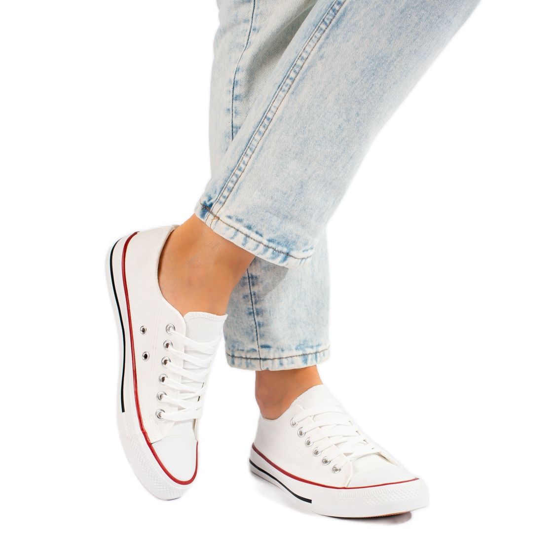 Eenvoudig, universeel en comfortabel: witte BM-sneakers zijn perfecte sportschoenen voor mensen die waarde hechten aan comfort en minimalistische stijl. Gemaakt van luchtige stof, met een rubberen profielzool en een laag plateau van 2 cm, waardoor ze het hele jaar door perfect zullen zijn - zowel in de lente en de zomer als in de koudere maanden.
